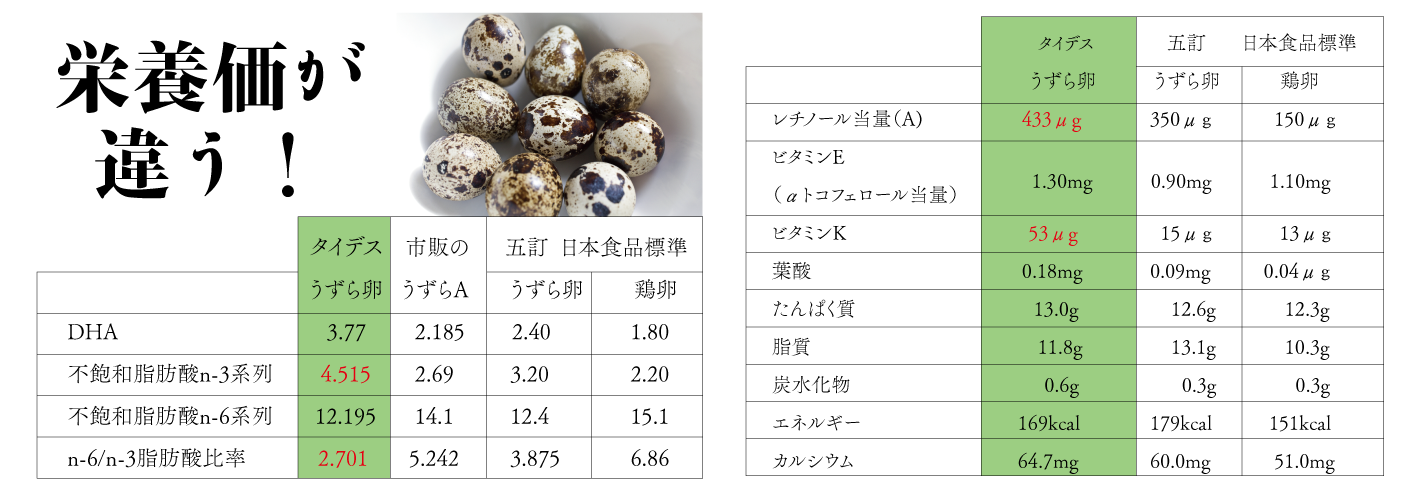 タイデスうずら卵の脂肪酸と栄養成分の比較(100g中)